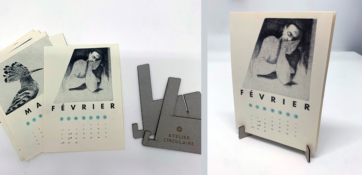 Le calendrier a été réalisé à l’Atelier Circulaire, avec affection, souci du détail et un profond enthousiasme : ses supports ont été découpés en gravure au laser et ses pages ont été imprimées en risographie. Chaque œuvre a été choisie à la fois pour ses qualités esthétiques et poétiques, ainsi que pour sa capacité à être transposée facilement dans cette technique d’impression.